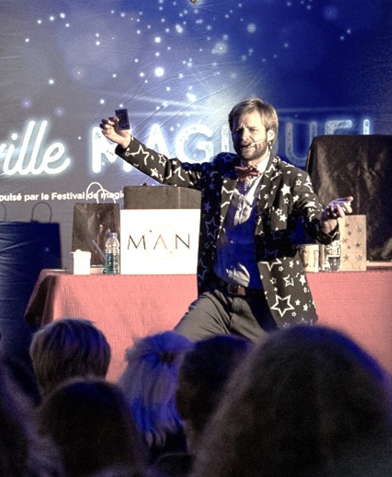 Spectacle de magie d’une durée de 45 à 50 minutes, offert à l’ensemble des enfants et à leurs parents. Ses spectacles sont une véritable source d’émerveillement, de joie et de stupéfaction pour les publics de tous âges. Avec finesse, humour et habileté, il propose des numéros spectaculaires et colorés où se succèdent transformations, disparitions, lectures de pensée, lévitations et bien plus encore. Ce spectacle interactif invite constamment la participation du public.