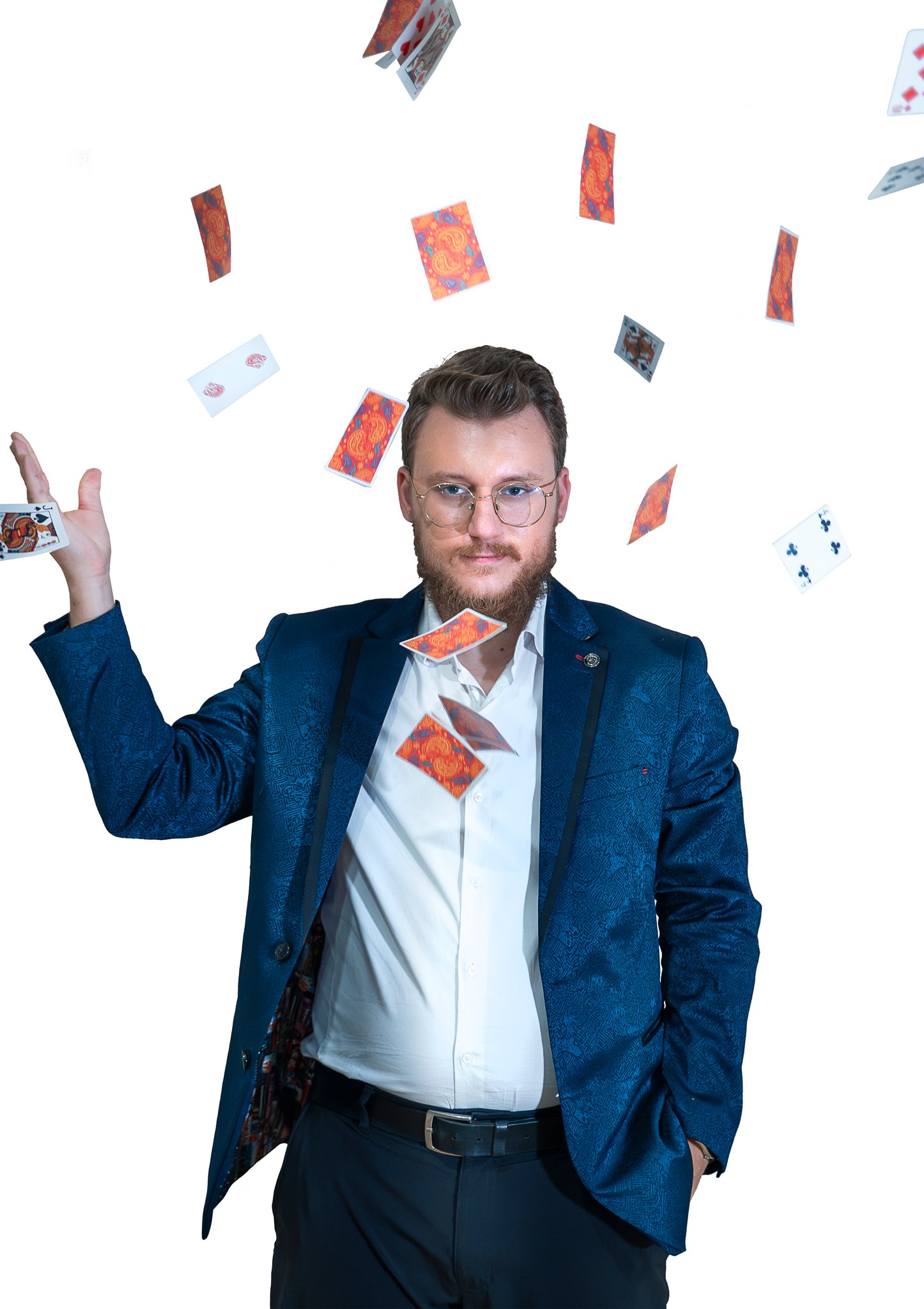 Magicien professionnel œuvrant dans le domaine depuis l’âge de 12 ans, Il se démarque par son style unique mélangeant magie, humour et interaction constante avec le public. Testé au travers des centaines de représentations, son spectacle inclut prédictions surprenantes, tours de cartes impossibles et rires inattendus! Que ce soit avec un cube Rubik ou avec la bague d’un spectateur, le spectacle sait divertir petits et grands!